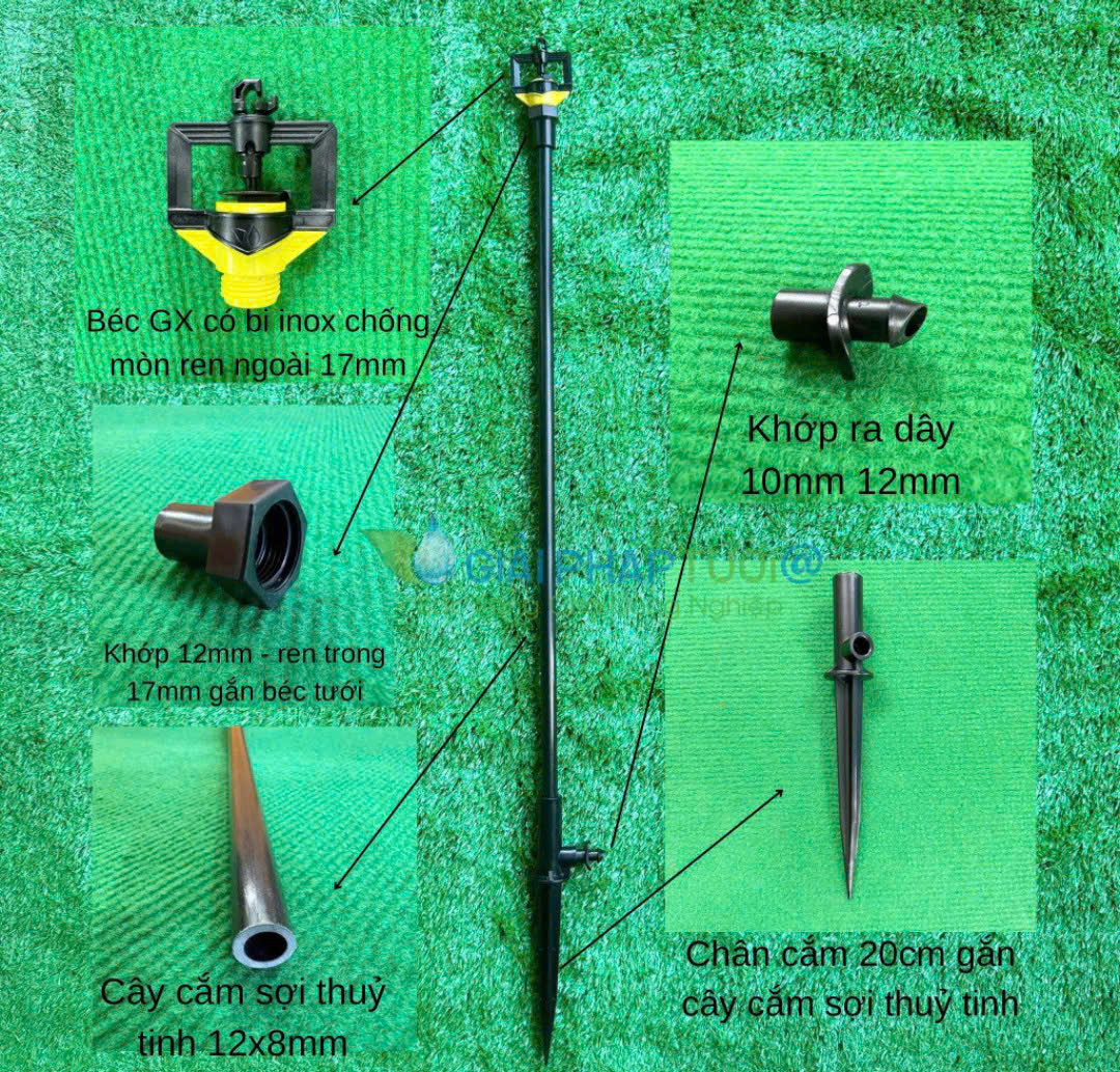Một số thông tin mô tả bộ béc tưới bù áp GX gắn sẵn cây cắm sợi thủy tinh 12mm cao 60cm gắn dây 10mm: