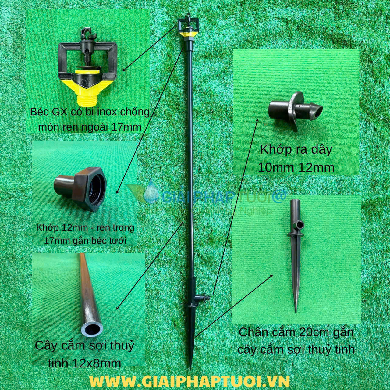 Một số thông tin mô tả bộ béc tưới GX gắn sẵn cây cắm sợi thủy tinh 12mm cao 170cm gắn dây 10mm: