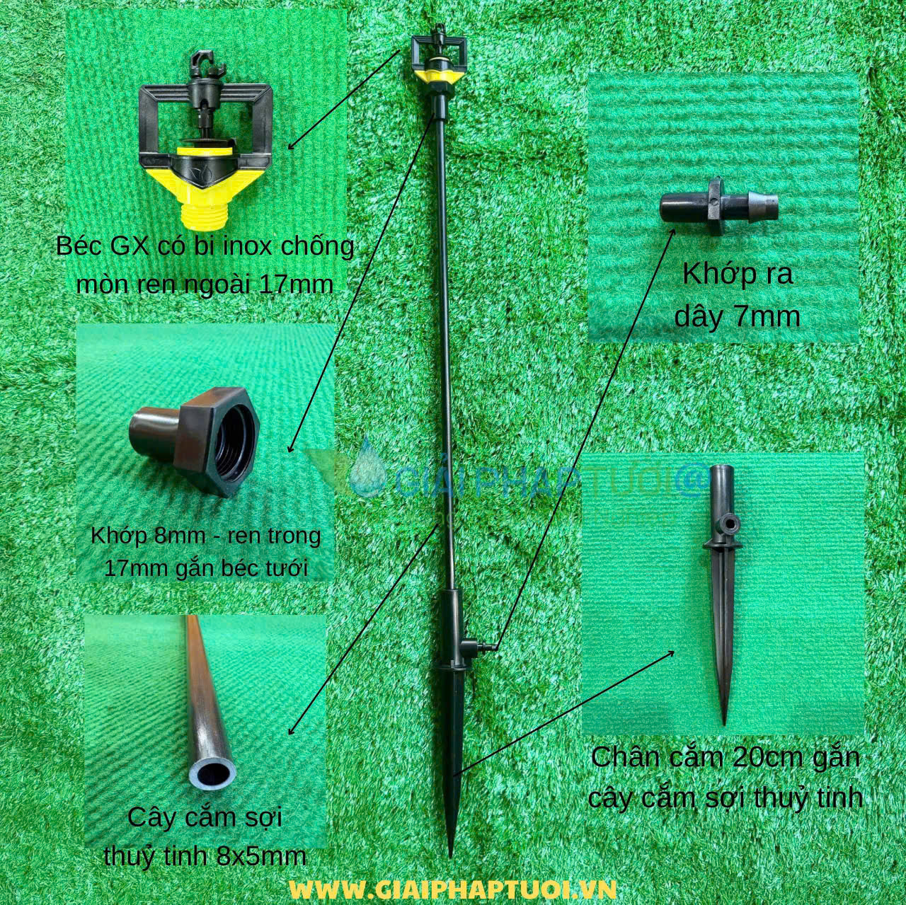Một số thông tin mô tả bộ béc tưới GX gắn sẵn cây cắm sợi thủy tinh 8mm cao 60cm gắn dây 7mm: