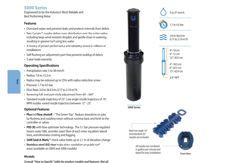 Mô tả một số tính năng và thông số kĩ thuật dòng béc tưới popup Rainbird roto 5004pc: