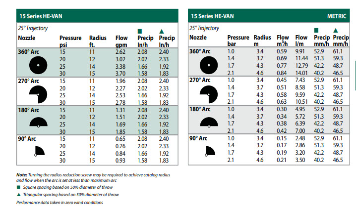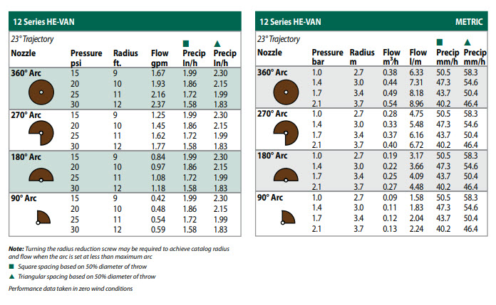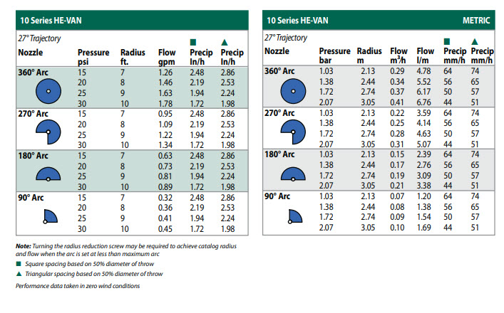 Bảng thông số áp lực, lưu lượng, bán kính của đầu phun 10 van, 12 van, 15 van: