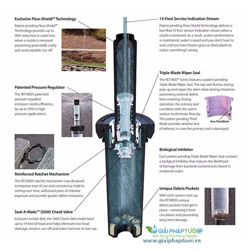 Mô tả một số tính năng và thông số kĩ thuật dòng thân phun popup Rainbird spray 1804:
