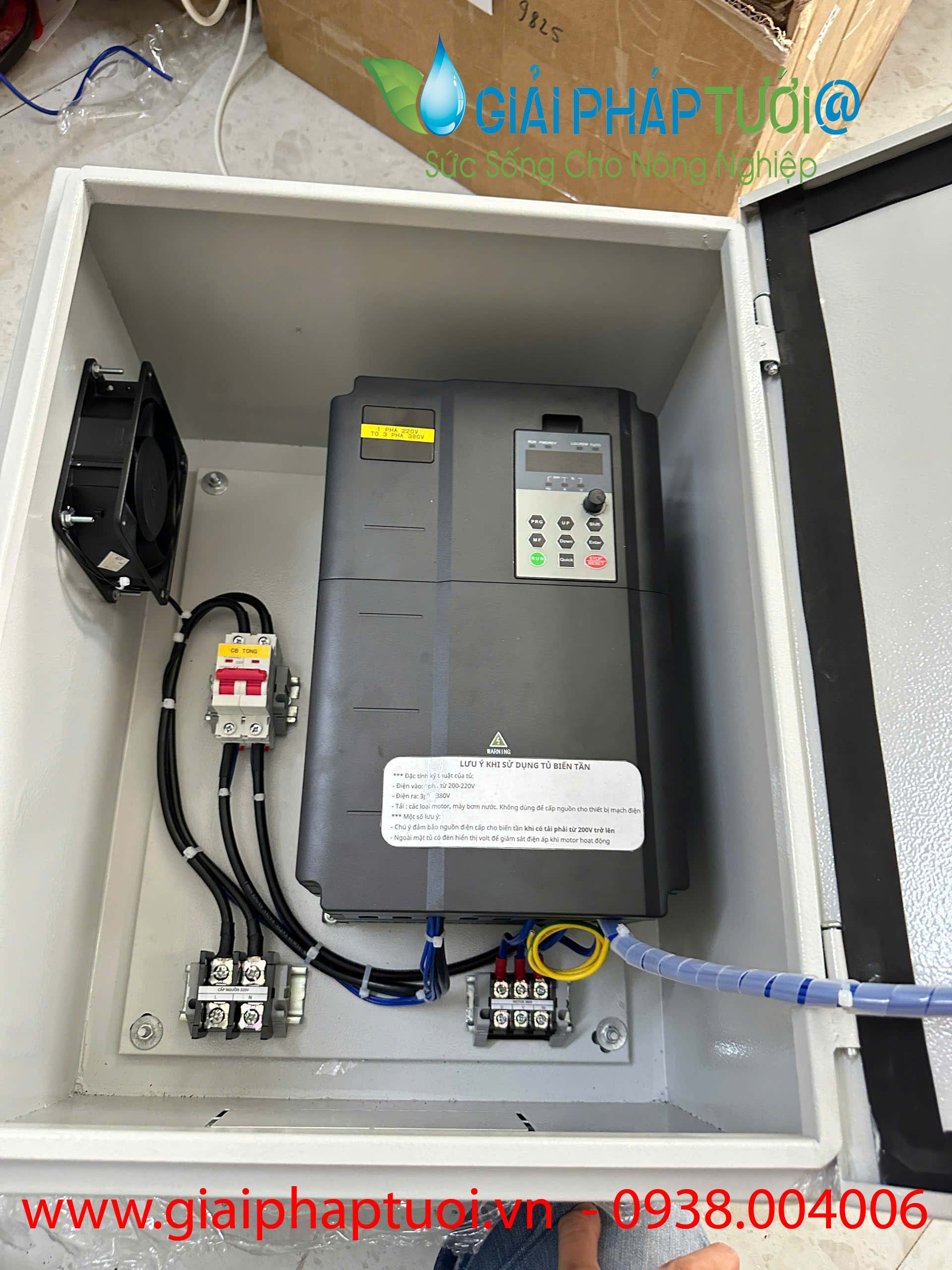 Như đã biết thì đa phần điện chúng ta sử dụng là nguồn điện 220V, nguồn điện này yếu không sử dụng được cho các máy bơm công suất lớn 380V. Do vậy, Giải Pháp Tưới @ cung cấp cho bạn tủ biến tần 1 pha 220V ra 3 pha 380V để đáp ứng nhu cầu này.