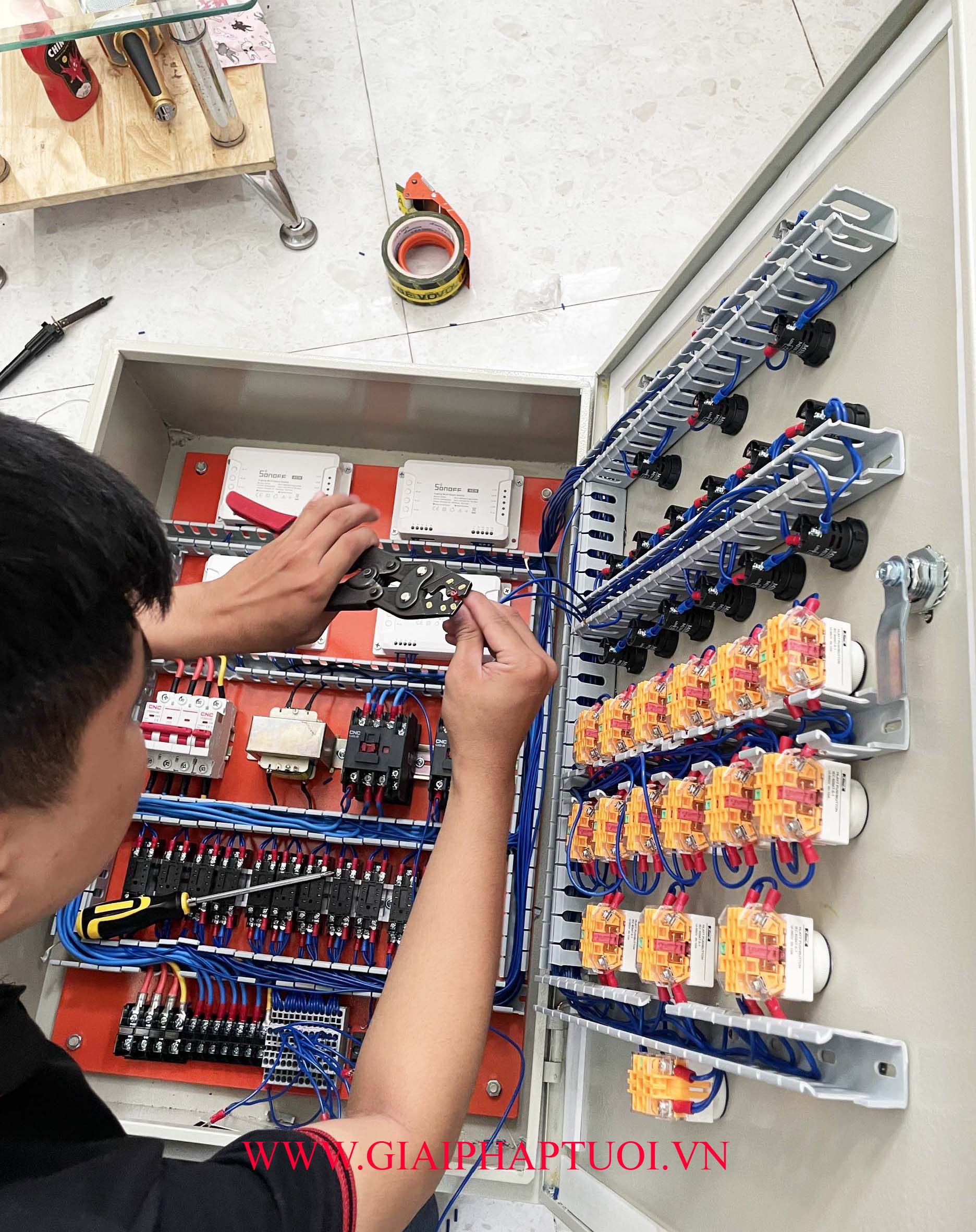 Tủ được đấu hoàn chỉnh theo tiêu chuẩn công nghiệp, bấm đầu có an toàn, đầu ra kí hiệu rõ ràng, dễ sử dụng