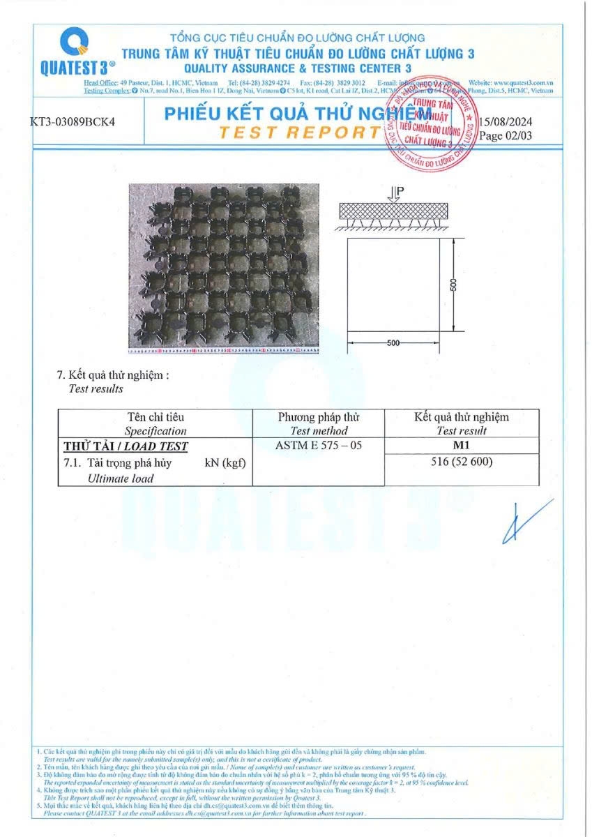Vĩ trồng cỏ thay thế gạch lát vỉa hè được thử nghiệm theo tiêu chuẩn ASTM E 575 - 05 để chịu được áp suất nén lên đến 4800KN/m2 và vượt quá yêu cầu tải trọng thông thường của xe, cụ thể là: