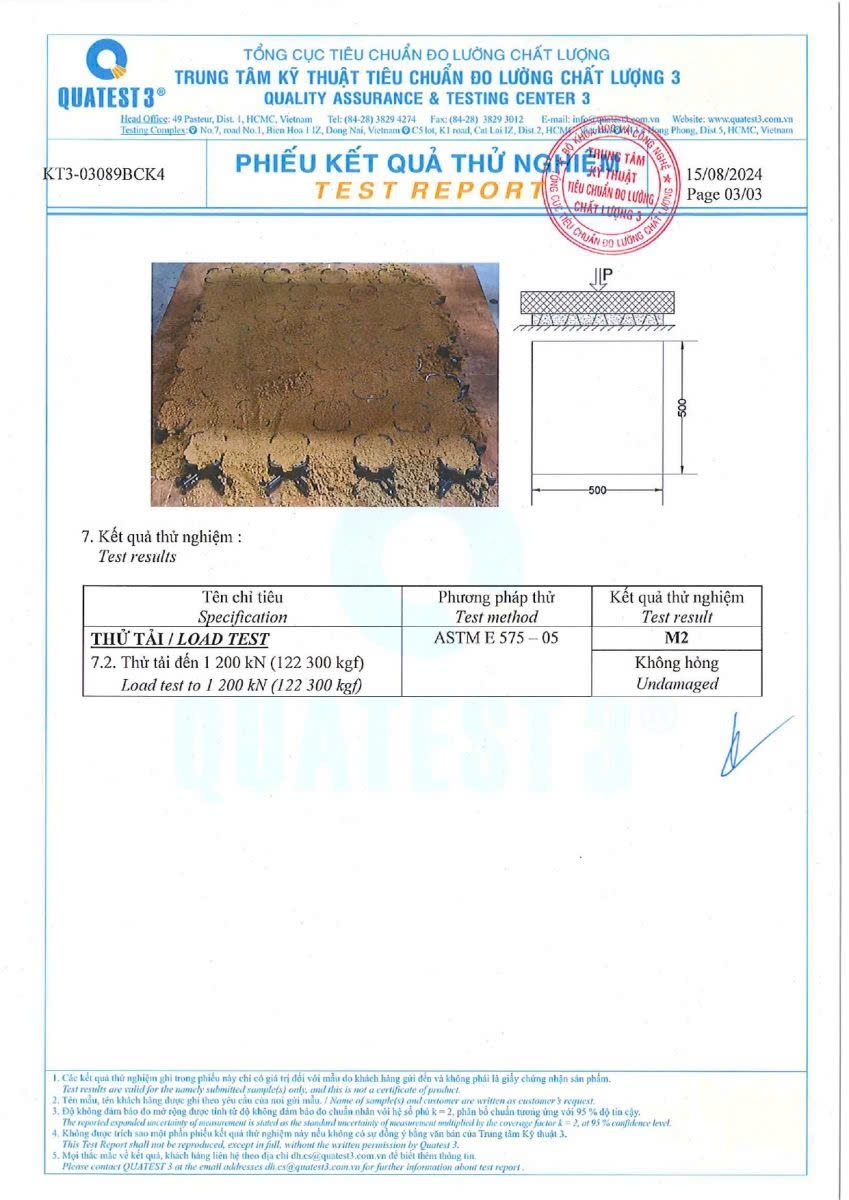 - Cường độ nén ( có lấp đầy cát): 4800 KN/m2
