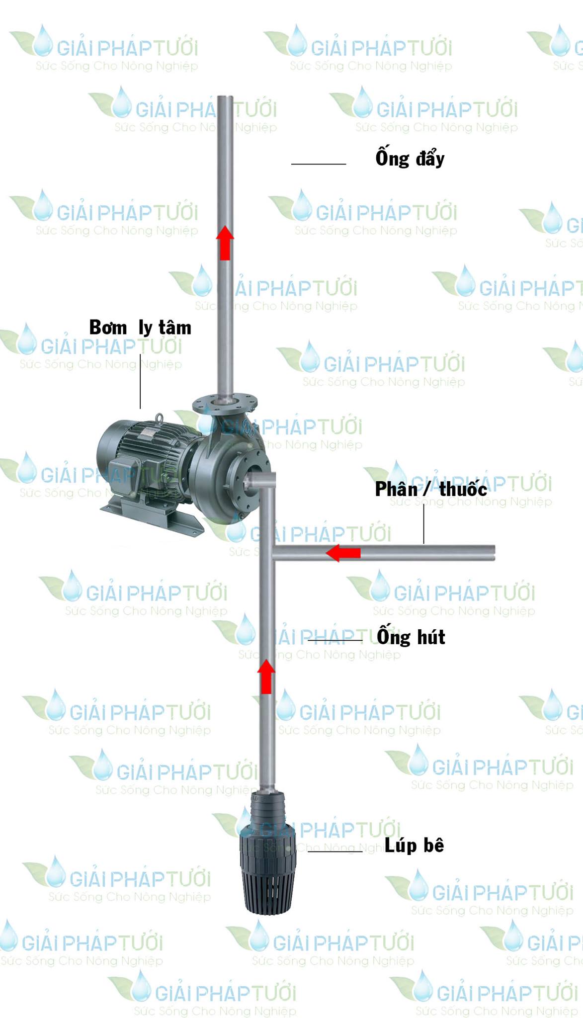 Để hút phân thật sự đạt hiệu quả, lượng nước phun đều như nhau tại mọi điểm từ đầu nguồn tới cuối nguồn, theo chúng tôi bà con nên gắn trực tiếp vào đường ống hút (chỉ tốn khoảng 100k) với cách đấu nối như hình dưới đây: