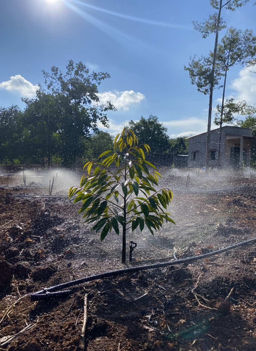 Khi cây sầu riêng còn nhỏ, bộ rễ chưa phát triển mạnh, bạn chỉ cần đặt mỗi gốc một béc tưới 360 độ. Điều này giúp nước được phân bổ đều quanh gốc cây, cung cấp đủ độ ẩm cho bộ rễ non. Việc tưới nước đúng cách sẽ giúp cây phát triển nhanh chóng và khỏe mạnh.