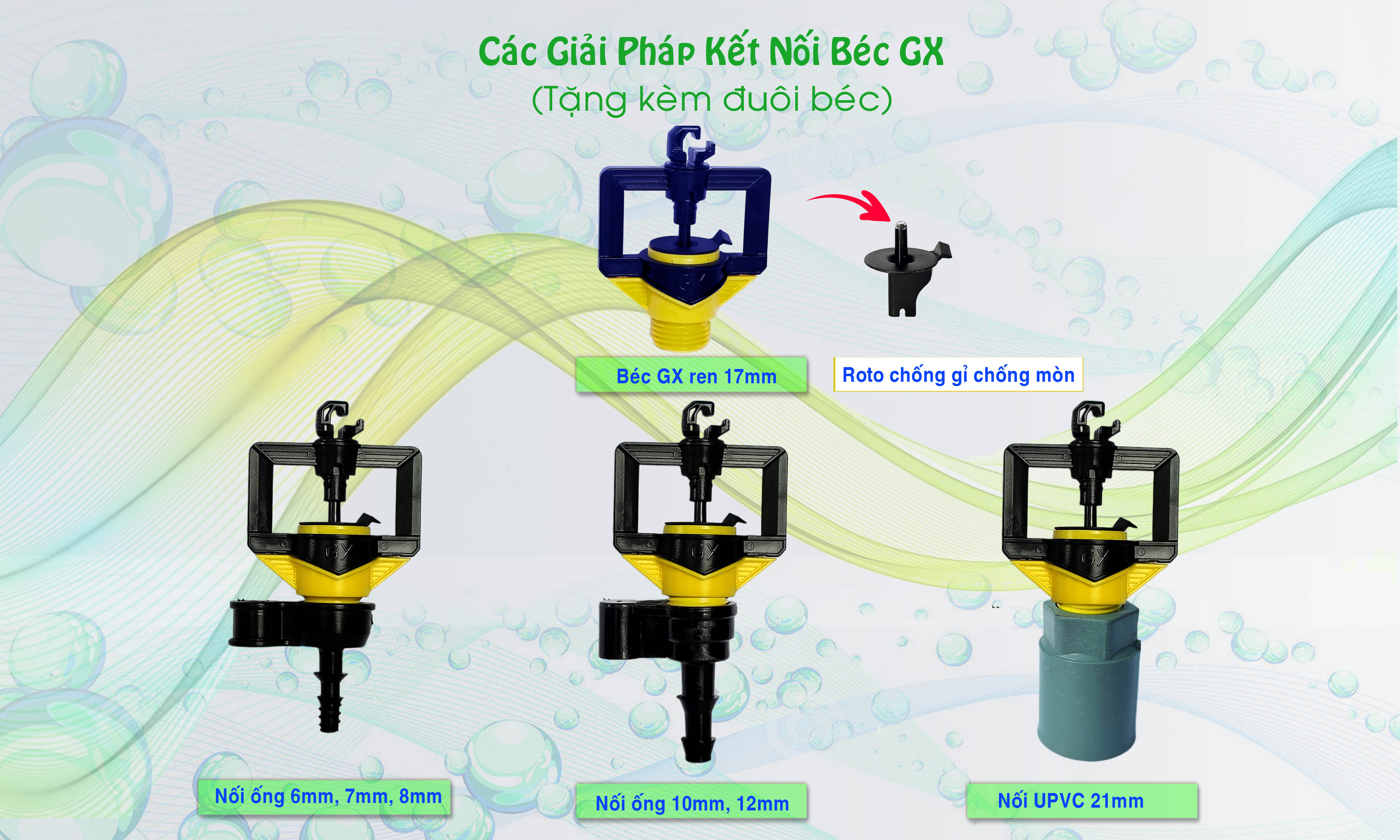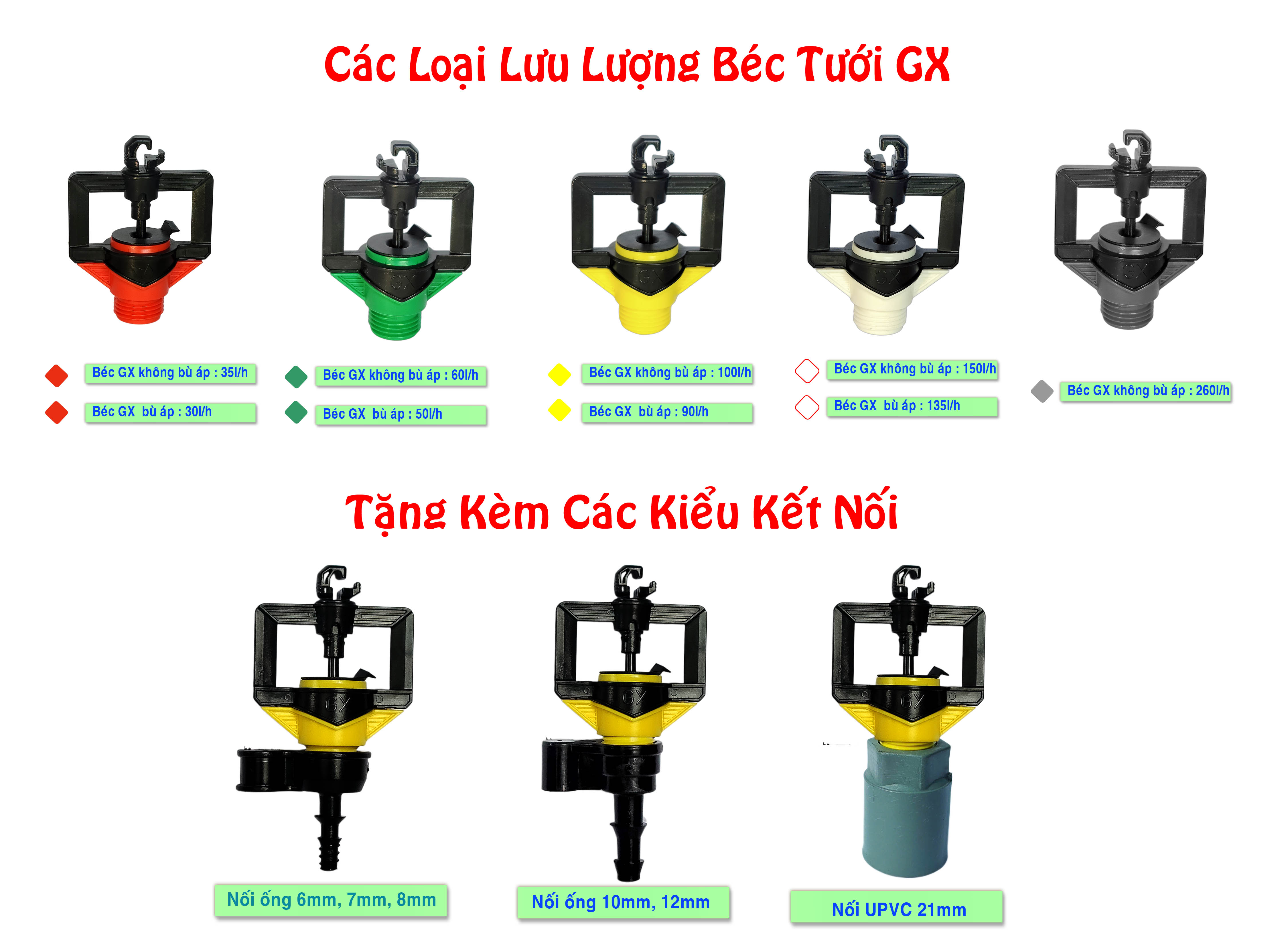 Béc GX còn hỗ trợ kết nối đa dạng với các loại dây LDPE (7mm, 8mm, 10mm, 12mm) cũng như kết nối với ống PVC (21mm). Sự linh hoạt này giúp người dùng dễ dàng lắp đặt hệ thống tưới mà không gặp phải khó khăn nào.